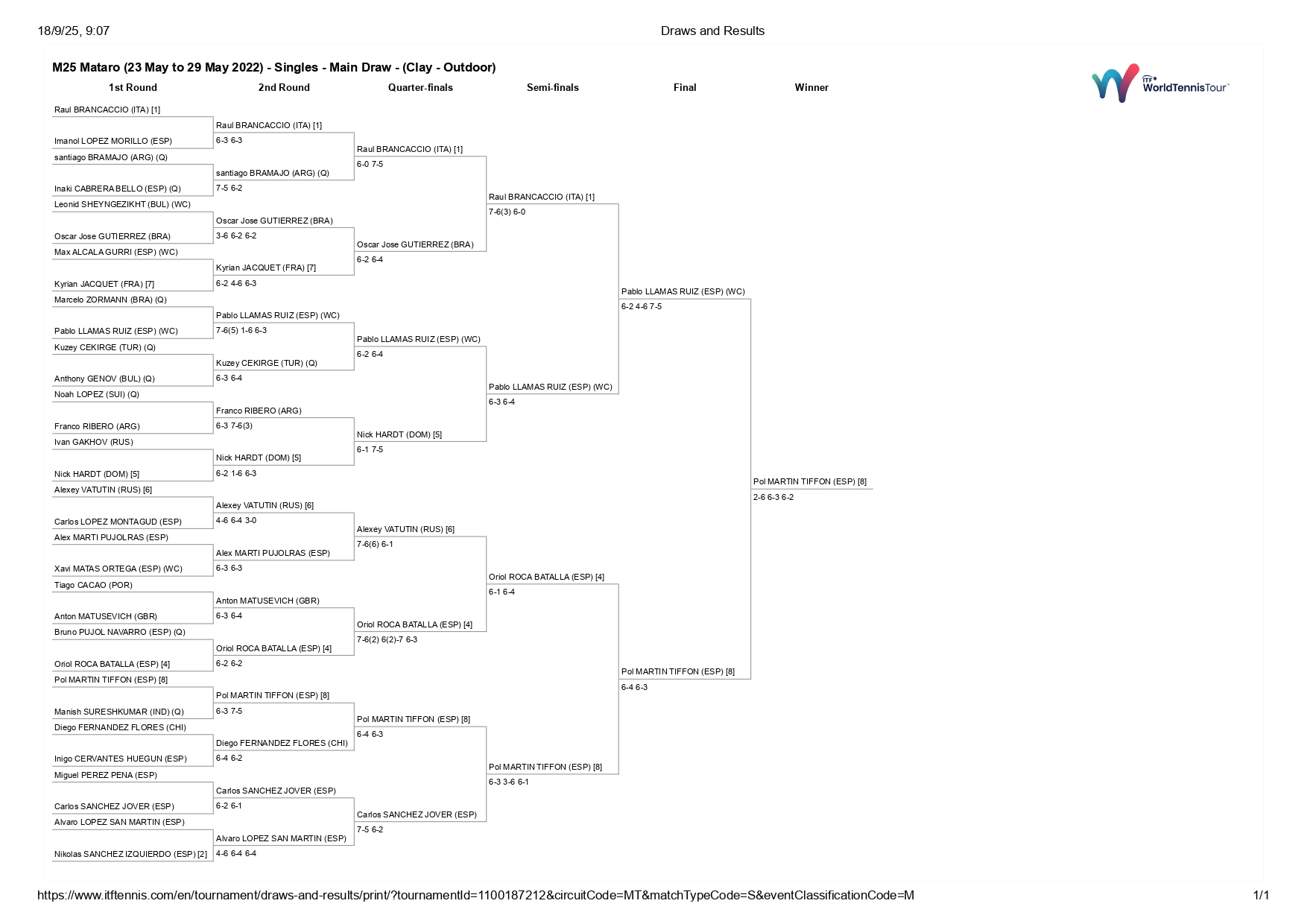El primer torneig mataronense va ser un èxit de participació, amb més de 100 tennistes inscrits de tot el món i amb una fase prèvia que va demostrar el talent que hi ha a casa. Des del club asseguren que ha estat un èxit tenístic i també de públic. El català Pol Martin Tiffon (378 ATP) va guanyar el torneig internacional de tennis ‘Ciutat de Mataró’. Per a ser campió, Martin Tiffon va haver d'imposar-se al gadità Pablo Llamas Ruiz després de tres sets (6-2, 3-6, 2-6). El partit va començar millor per a Llamas que per a Tiffon. En mitja hora, l'andalús manava en el marcador i en la pista, on es mostrava més segur i confiat que el tennista català. Tiffon va trobar a faltar la força del seu servei durant els primers punts i això ho va aprofitar Llamas per a guanyar-li terreny i la moral (6-2). En canvi, Tiffon va anar creixent a partir del segon set. “L'estabilitat mental i la consistència m'han permès aguantar en els moments difícils. He acceptat la situació i, malgrat que no estava en el meu màxim pel desgast de les últimes setmanes, sabia que Pablo baixaria la intensitat en algun moment”, va dir. I així va ser. Les fallades no forçades de Llamas li van carregar de moral i li van permetre empatar el partit (3-6) i acabar guanyant per insistència i coratge (2-6). Per part seva, Llamas es va rendir a la potència de servei de Tiffon i va ser incapaç d'aguantar-li el ritme en l'últim set (2-6).