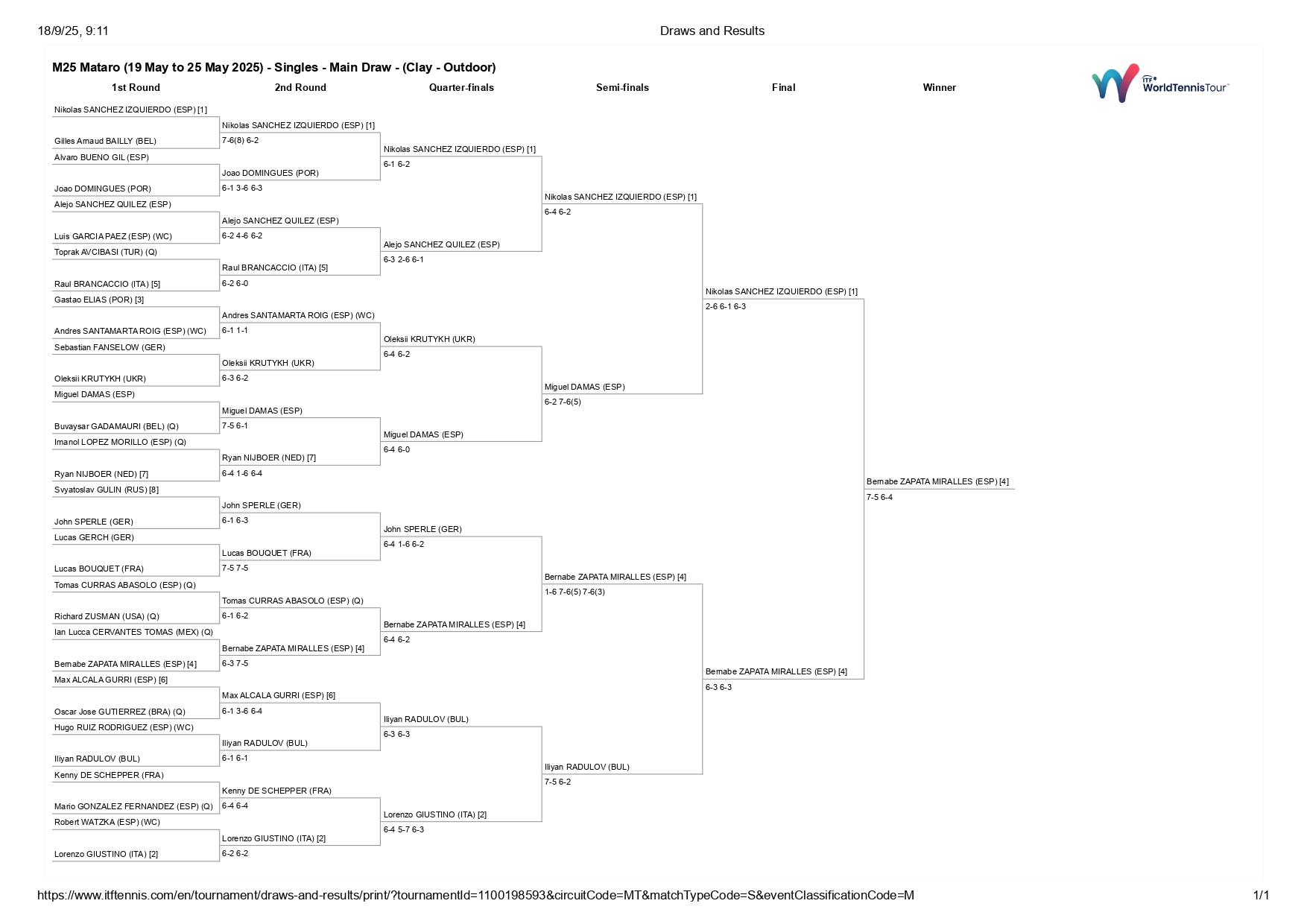 El triomf de Bernavé Zapata ha estat fruit d’un joc sòlid, dinàmic i amb molta personalitat damunt la pista. Després d’una setmana plena d’emocions i partits d’altíssima qualitat, el Club Tennis Mataró trobava un nou guanyador. Durant el torneig, hi han participat tennistes destacats com Miguel Damas, Lorenzo Giustino i el búlgar Iliyan Radulov. La final ha arrencat amb força per part de Zapata, que ha deixat clares les seves intencions amb un contundent 3-0 d’inici. Amb un tennis segur i agressiu, ha posat contra les cordes un Sánchez Izquierdo que ha trigat a trobar el seu ritme. Amb el pas dels minuts, però, el català ha anat creixent i retallant distàncies fins a igualar el set (5-5), tot i que finalment Zapata s’ha imposat per 7-5. Després de recollir el trofeu, Zapata ha expressat la seva satisfacció: “Ha estat una setmana molt positiva, em poso un 9. Sabia que el Niko té una dreta potent i que havia de ser agressiu per guanyar-lo. He fet un partit molt complet”. També ha volgut agrair el tracte rebut: “Aquest club és meravellós i molt familiar, m’hi he sentit com a casa. Gràcies per apostar per aquest tipus de competicions”. Dobles per a Poljak i Ruehl En la competició de dobles, la parella formada per David Poljak i Tim Ruehl van ser la guanyadora, superant els espanyols Avendaño i Llorens Saracho.