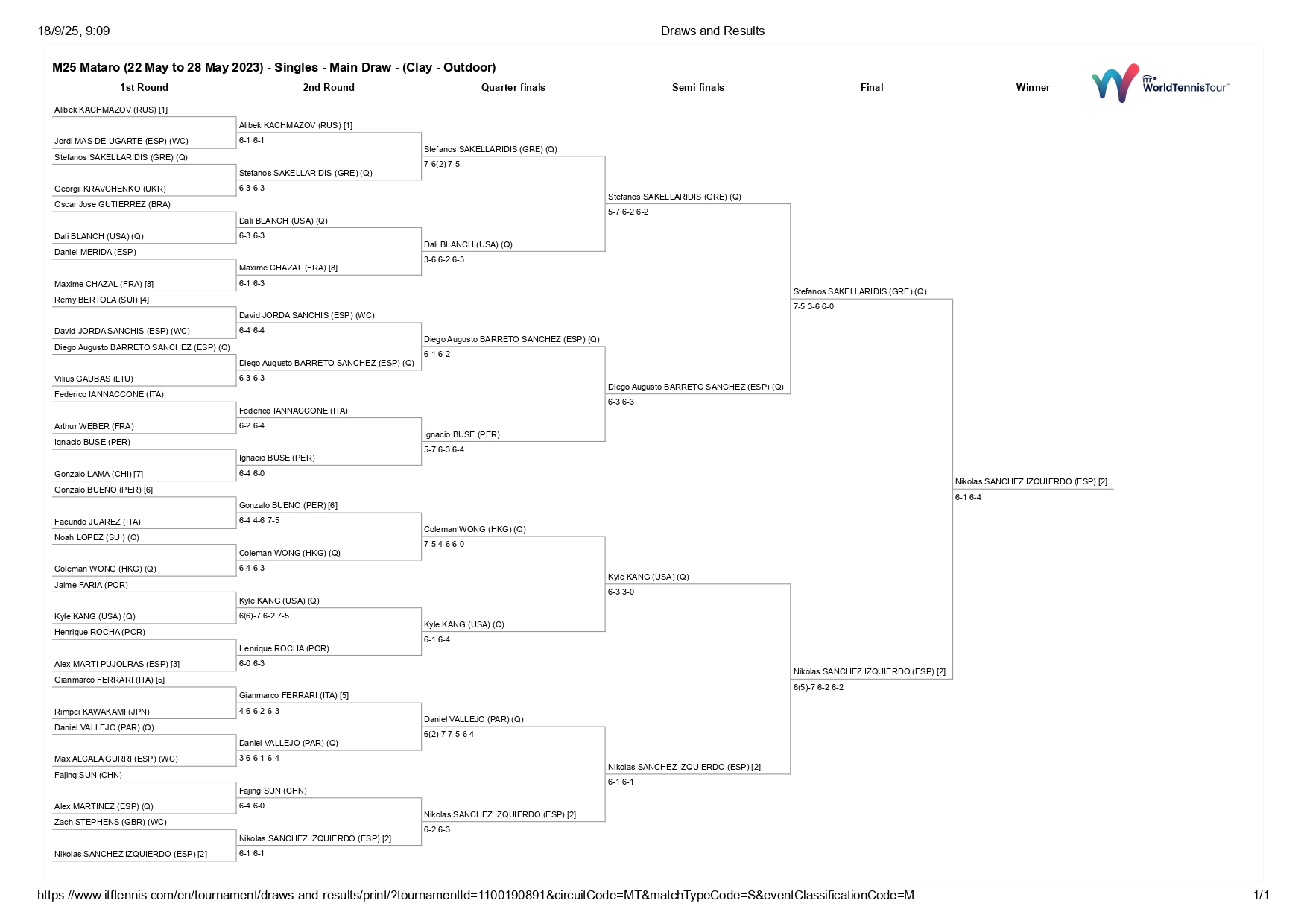 Va imposar-se en la final al grec Stefanos Sakellaridis en dos sets (6-1, 6-4), el partit no va tenir gaire misteri, el tennista català, de 24 anys, va poder aixecar el trofeu de campió sense gaire obstacles. En 42 minuts havia guanyat el primer set amb certa comoditat a un jove Sakellaridis que va presentar més batalla en el segon set. El mateix Sánchez Izquierdo admetia que s’havia sentit més còmode en el segon set, quan cada punt s’havia hagut de suar més: “He sabut estar bé tàcticament i imposar la meva llei”. “Guanyar és increíble i més a casa. Qualsevol torneig d’aquest tipus és molt difícil, perquè sempre hi ha imprevistos. Són 5 partits i passen moltes coses”, assegurava Sánchez Izquierdo, que tambe reconeixia cert cansament físic, perquè en 15 dies ha guanyat dos ITF: a Valldoreix el passat 14 de maig i ara a Mataró, molt a prop de casa. “En aquest club he passat 9 anys de la meva vida formant-me així que és un plaer per a mi guanyar aquí, afegia Sánchez, que ara buscarà entrar al circuit Challenger i es prepara per jugar prèvies de torneigs ATP. El sotscampionat ha estat per al jove grec de 18 anys Stefanos Sakellaridis. Una de les sorpreses del torneig, perquè partia de la ronda prèvia i va deixar pel camí a un dels favorits, el rus Kachmazov i a l’americà Blanch. Ferrari i Remy, guanyadors dels dobles També hi va haver premi per a l’italià Gianmarco Ferrari i el suís Remy Bertola, que arribaven amb ganes de fer un bon torneig a nivell individual i van acabar aixecant el trofeu de campions en dobles. Dissabte 27 de maig i després d’una hora i mitja de partit van proclamar-se guanyadors després de superar la parella portuguesa formada per Rocha i Faria (7-6, 2-6, 11-9).